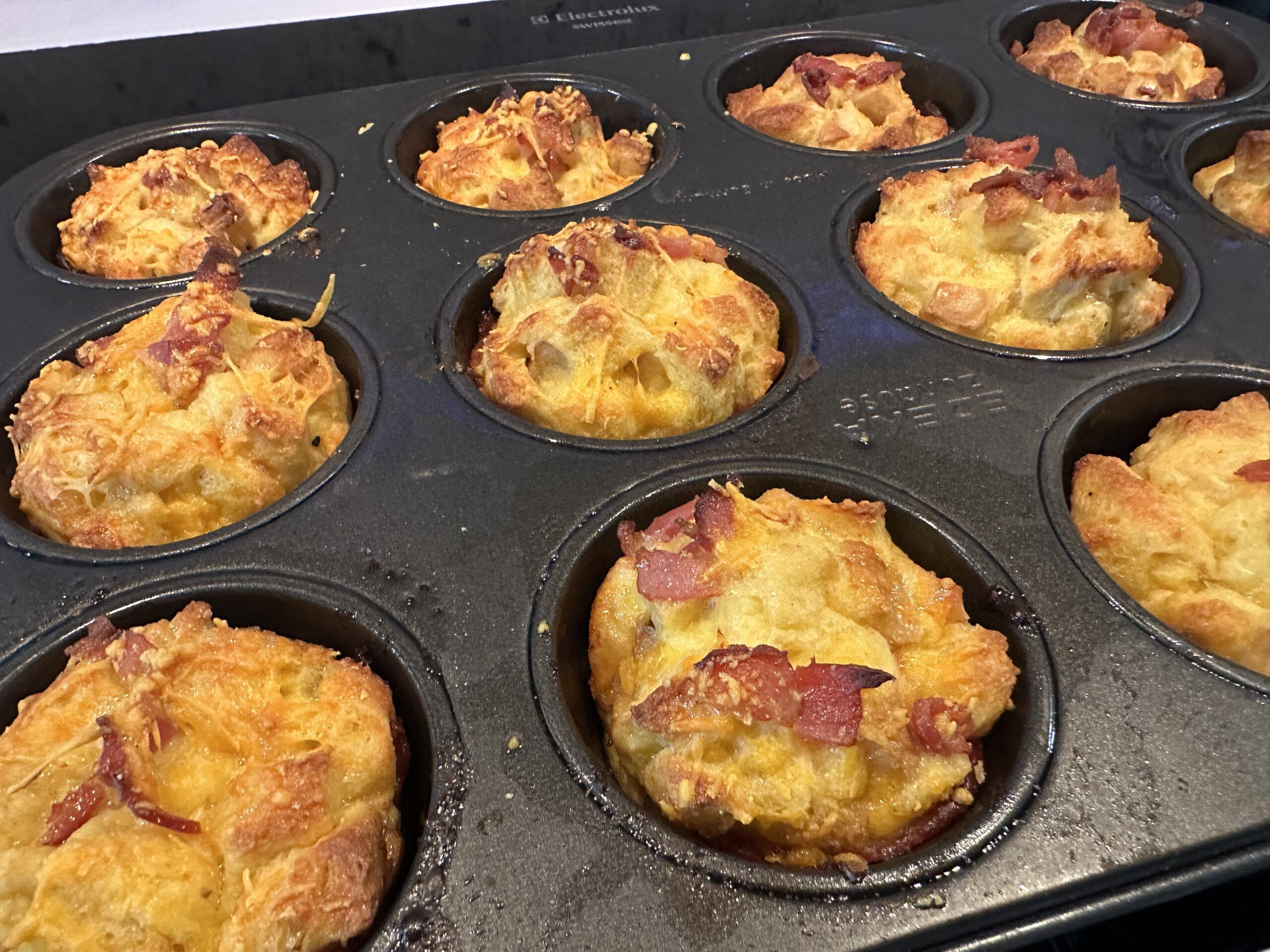 - Je zwei halbierte Bacon-Scheiben kreuzförmig in jede Muffin-Mulde legen, sodass sie die Wände auskleideen