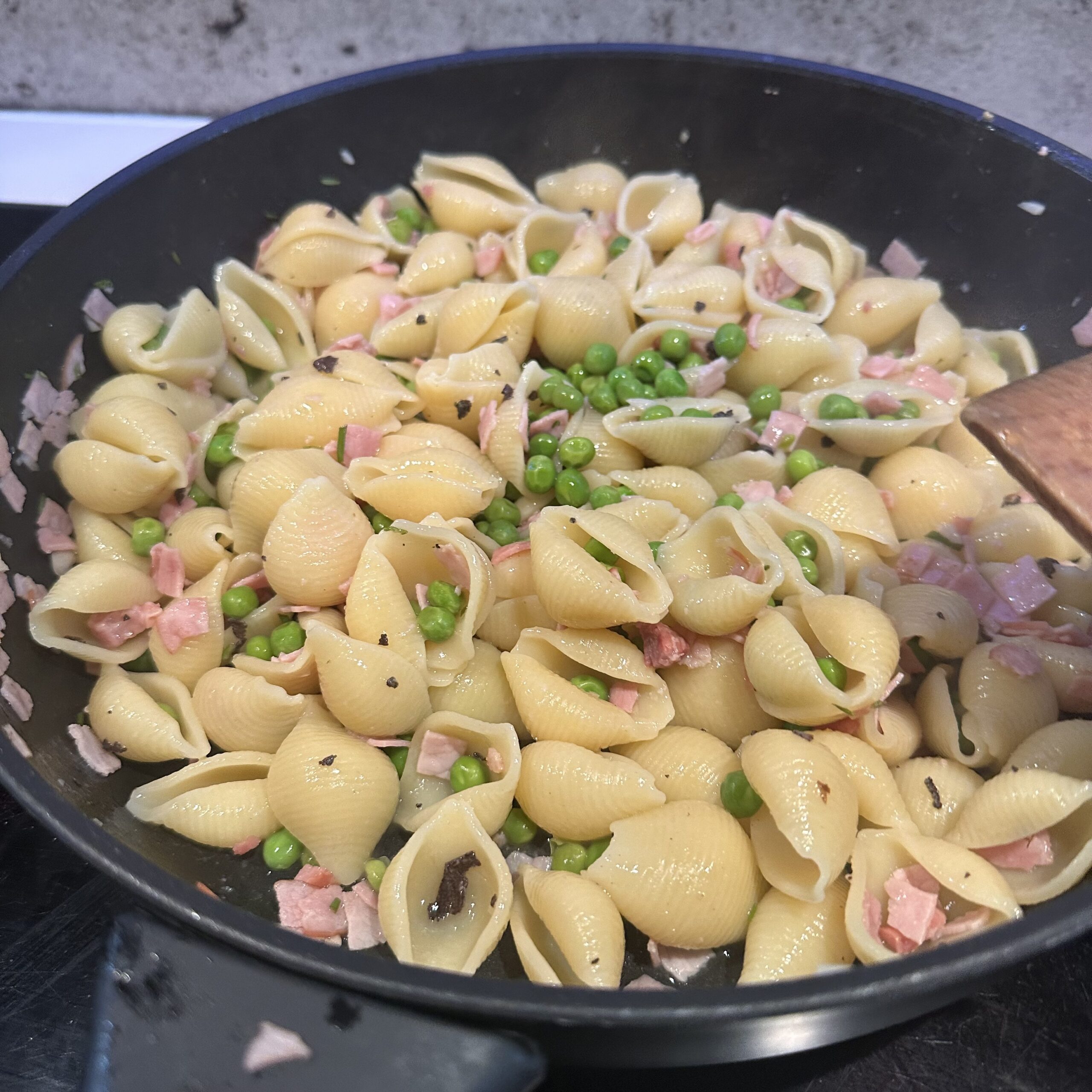 - Etwas Pastawasser und die gefrorenen Erbsli beigeben
